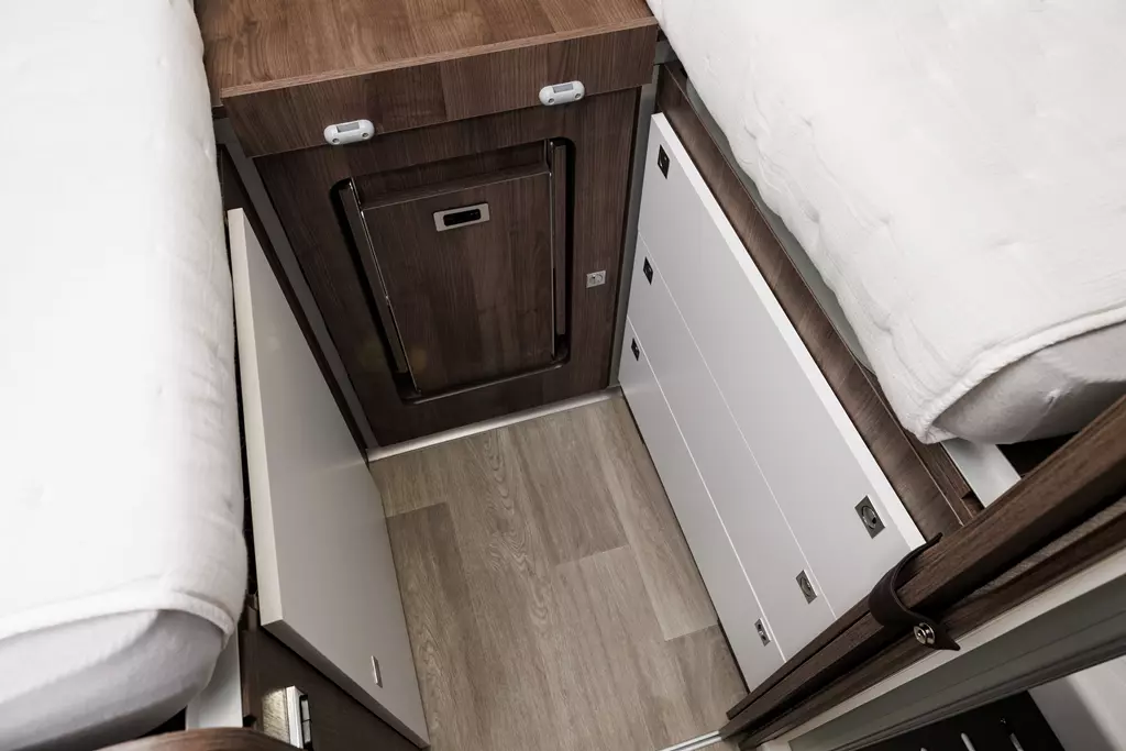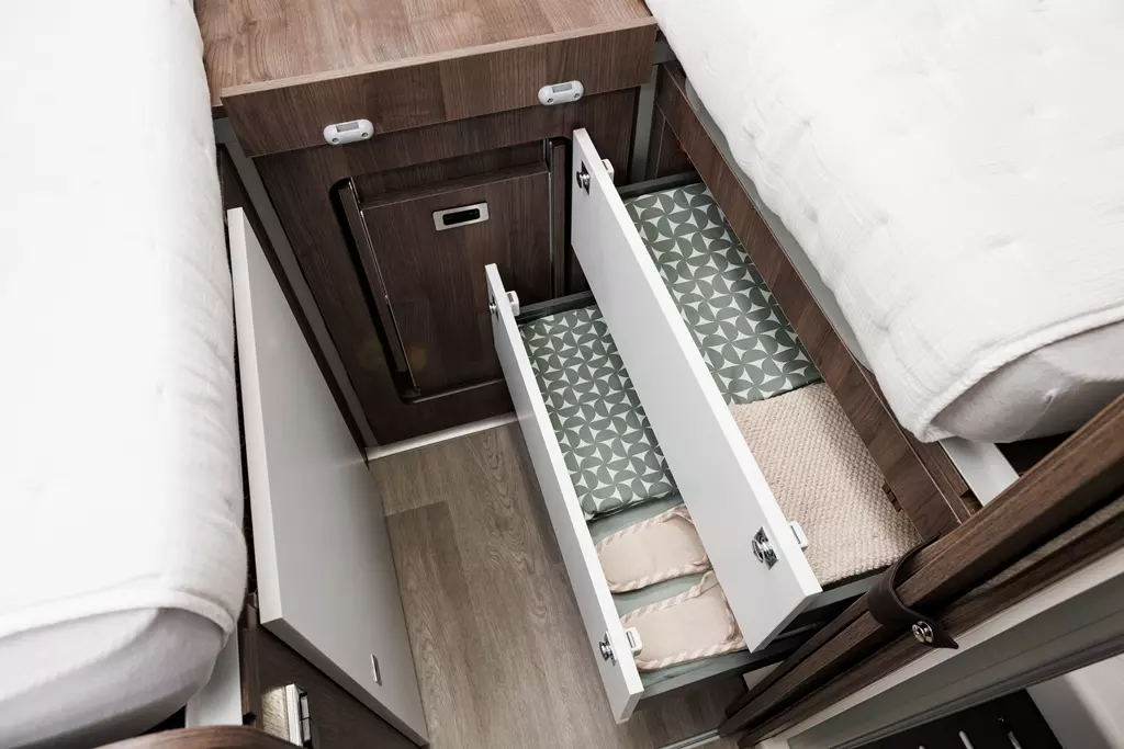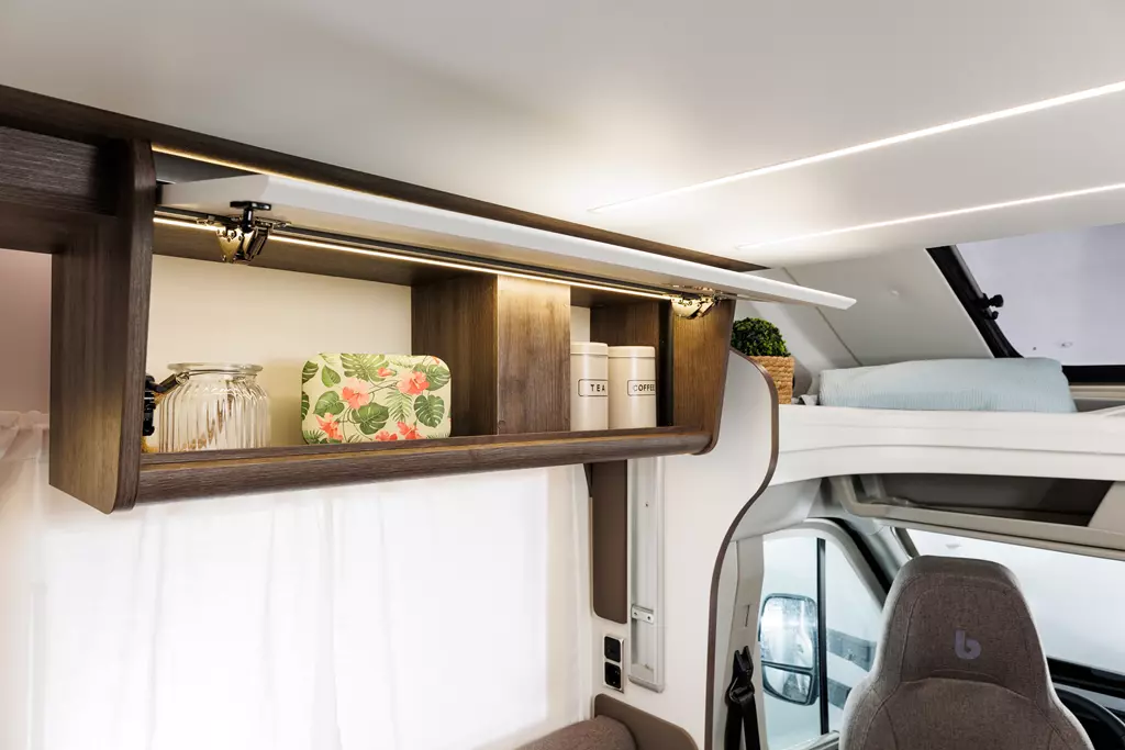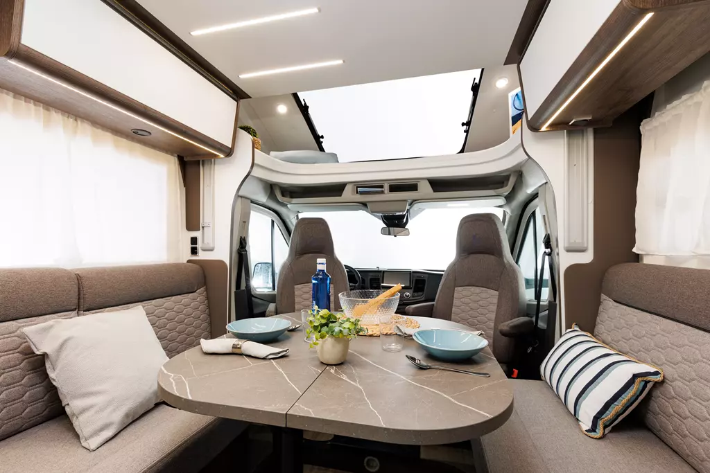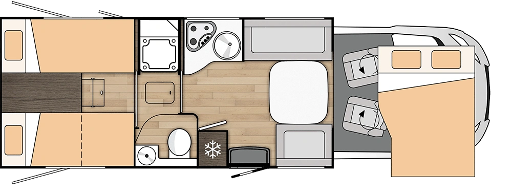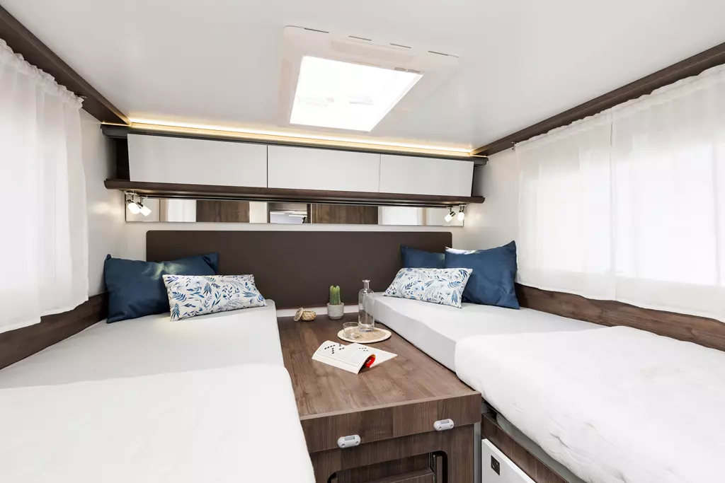 To jeden z najbardziej funkcjonalnych kamperów w swojej klasie. Benimar Tessoro 463UP to wersja stworzona z myślą o rodzinach, parze z dziećmi lub grupie znajomych, którzy cenią sobie przestrzeń, wygodę i nowoczesne rozwiązania. Na pokładzie znajdziesz dwa pojedyncze łóżka w tylnej części pojazdu z możliwością ich połączenia w jedno duże łoże, oraz elektrycznie opuszczane łóżko nad salonem, które w ciągu kilku sekund zmienia część dzienną w komfortową sypialnię.